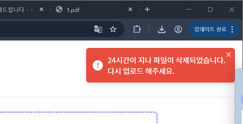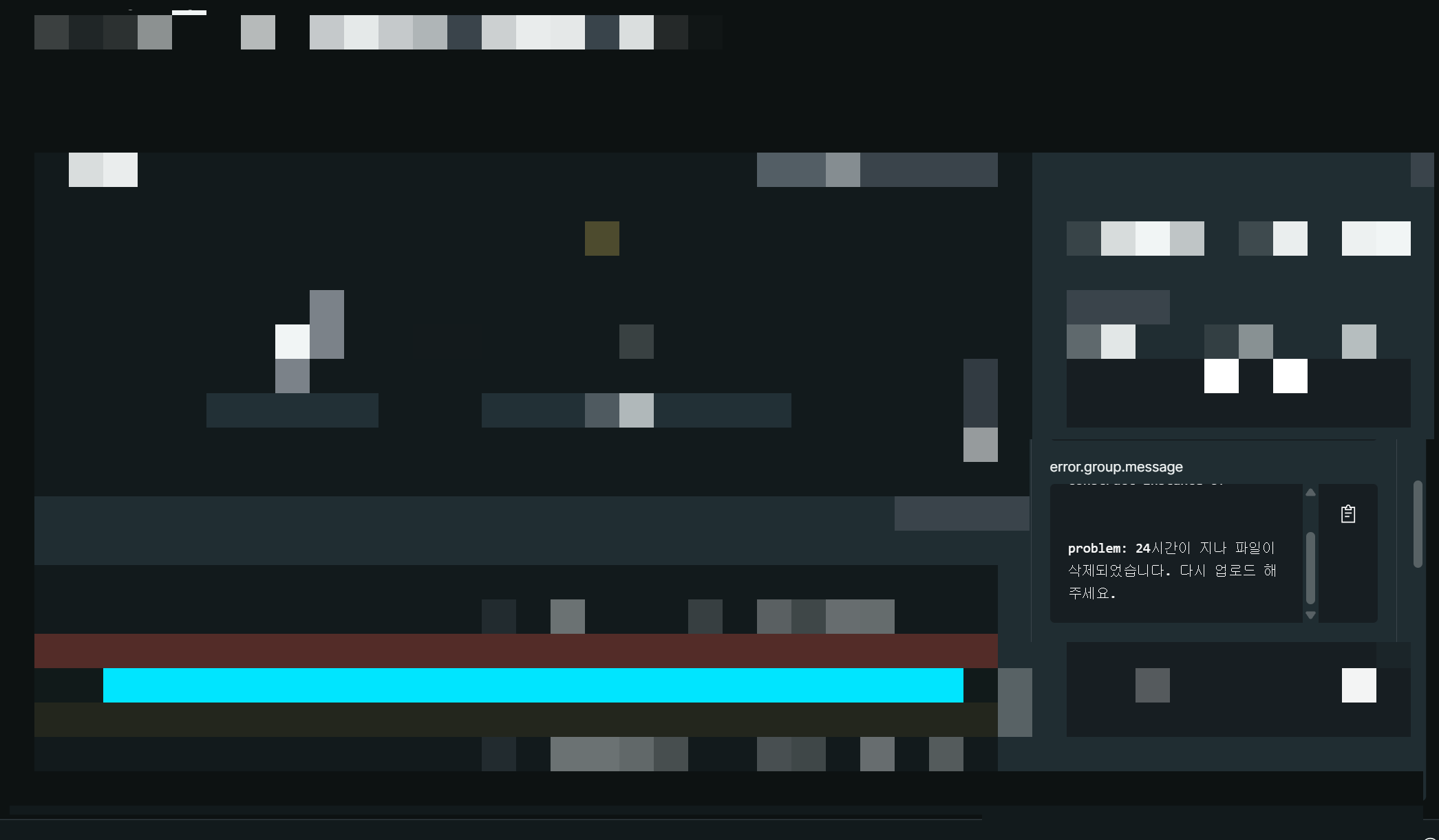 현재 업로드 된 파일을 담는 S3는 저작권 문제로 24시간이 지나면 자동으로 파일을 삭제한다. 만일 사용자가 로컬 스토리지에 저장된 파일 url로 다시 요청을 하면, 24시간이 지나 S3에 해당 파일이 없으니, 다시 사용자에게 입력을 받는 에러 메세지이다.