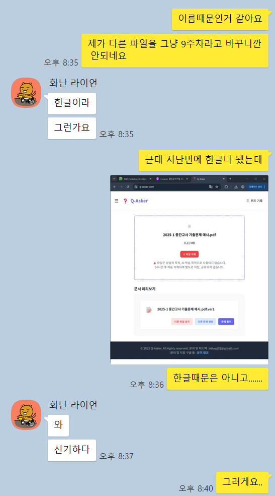 한글 때문에 오류가 난다고는 생각 못했다. 왜냐면 배포 전 테스트 때도 한글 이름의 파일을 넣었는데 정상적으로 문제가 제작되었기 때문이다.