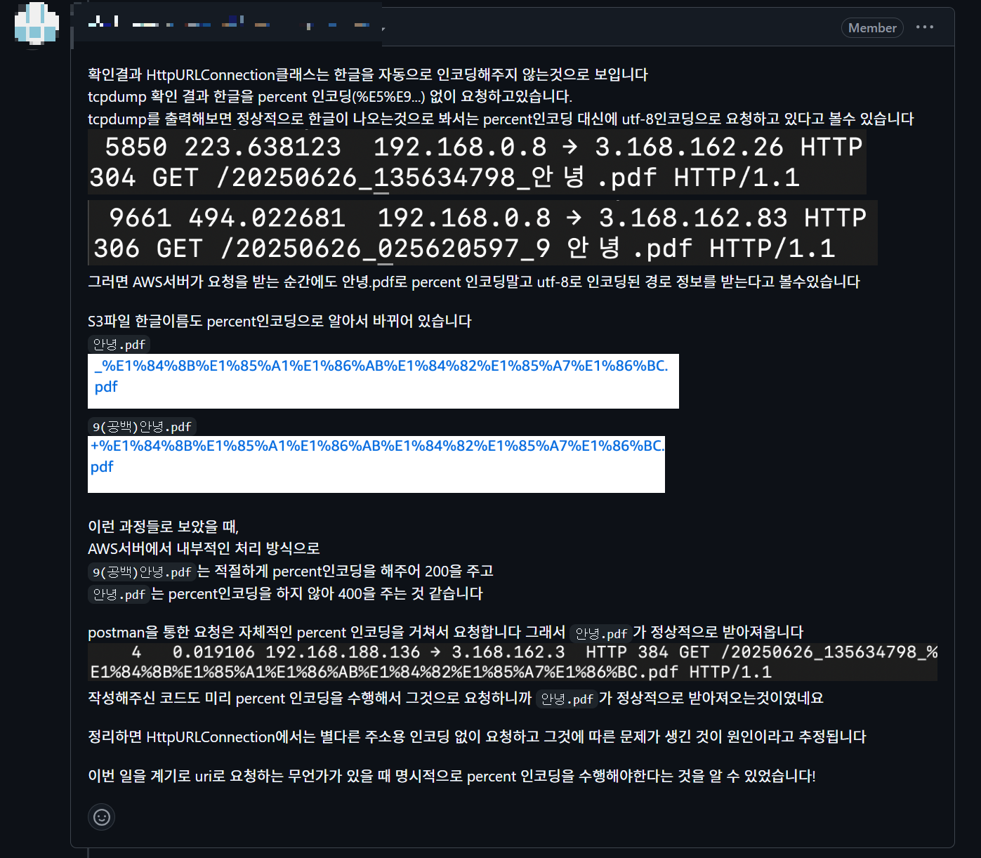 기존에 작성한 코드 중 HttpURLConnection은 인코딩 없이 보내고, AWS에서는 한글만 있는 파일명을 percent 인코딩을 하지 않는다. 공백의 경우는 AWS 서버 내부에서 인코딩을 처리해 에러가 나지 않는 것이다. (이 원인도 찾고 싶은데 그건 못찾겠다..)