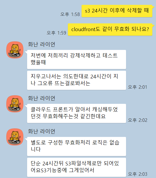 그러나 이건 때에 따라 다르게 적용됐고, 아마 cloudfront 캐시 무효화가 S3 24시간과 함께 진행되지만, 만일 S3에서 강제로 파일을 삭제하면 자동으로 되는 경우가 있고 안되는 경우가 있는 것 같다.