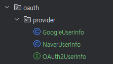 이런식으로 OAuth2UserInfo interface를 선언한 수 각 사이트의 클래스를 생성했다. 이후 인터페이스를 오버라이딩 한다.