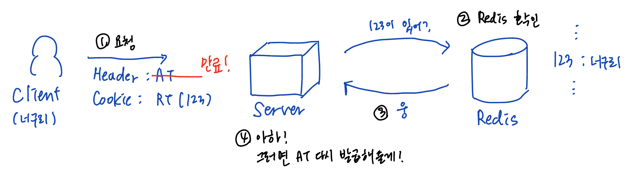 그래서 별 다른 정보를 담고 있지 않고, 식별의 용도로만 사용된다. (access token에 비해 유효기간이 길기 때문에 당연히 정보를 담고 있으면 보안 상 문제 있음) 나의 경우 랜덤 값을 저장했다.