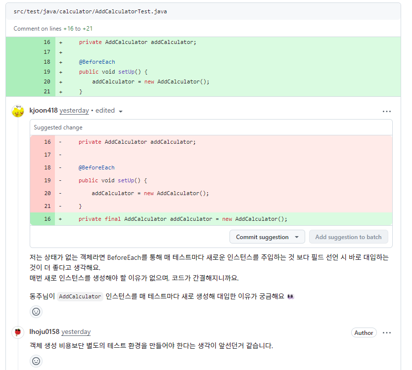 - 각 테스트 메서드 마다(per-method) 새로운 테스트 인스턴스가 만들어지는 것은 JUnit의 기본 동작방식이다.